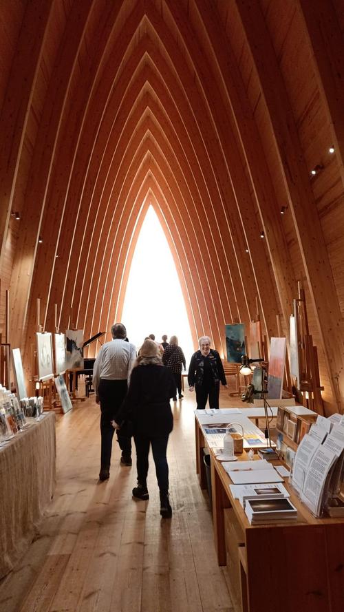 Sen jälkeen jaksoikin taas matkustaa eteenpäin, ja menimme Pyhän Henrikin Ekumeeniseen Taidekappeliin, missä oli aivan ainutlaatuinen tunnelma ja henki. Kaikki taisivat pysähtyä ovelle, mistä näkyi ihanasti koko rakennus ja edestä tuleva valo. Sitä vuokrataan juhlatilana; häät, kasteet ja muut kirkolliset tilaisuudet, yksityistilaisuudet, ja ryhmäopastukset. Löytyy taidegalleria, myyntinäyttely, nytkin oli tauluja, koruja ym. Loistava konserttitila, akustiikka todella mahtava, ja on palkittu rakennustaiteellinen nähtävyys, jota käydään katsomassa ulkomailta asti.